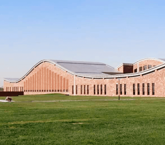 建筑基地北有石碑河,南有新石碑河兩條河流。建筑造型從所處環(huán)境出發(fā),以流動(dòng)的水作為媒體,這樣兩條舞動(dòng)的絲帶呼應(yīng)兩條河流成為建筑形象首選。如絲帶般飄逸的金屬屋頂弧線自然流暢,中間用內(nèi)庭院隔開(kāi),絲帶南北兩側(cè)呈對(duì)稱式布置。南北立面形象彼此呼應(yīng),完美互補(bǔ)。