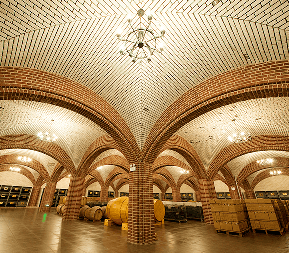 通過(guò)工業(yè)連廊和游客連廊與釀酒堡緊密相連,酒窖的拱券頂和地下走廊的拱券頂設(shè)計(jì)除了美化裝飾作用的同時(shí),還有一種歷史的文化沉淀在里面??傮w布局采用環(huán)抱式與中央陣列布局式相結(jié)合,打造出歐式四角拱頂?shù)目臻g格局,打破傳統(tǒng)酒窖厚重的華麗風(fēng)格,通過(guò)白色碎小磚塊裝飾頂面與墻面,打造出地中海式簡(jiǎn)約風(fēng)格的酒窖場(chǎng)所,為藏酒區(qū)環(huán)境和參觀者的內(nèi)心共同創(chuàng)造了質(zhì)樸,輕松、雅靜的感覺(jué)!